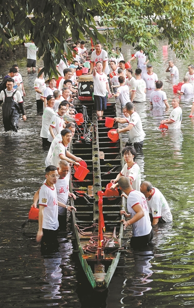 泮塘村村民在荔灣湖公園“龍船竇”“起龍”之后,隨即清洗、裝飾,并在荔灣湖上試扒,展示泮塘兒女的精氣神