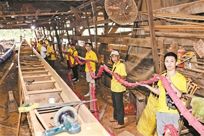 廠房里揮汗如雨,木屑紛飛,工匠們一錘一刀手工雕琢嶺南水鄉(xiāng)人的圖騰——龍舟。