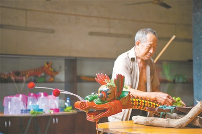 “補漏要把顯示有縫隙的地方全部扒開,清理積塵后重新咬合拼接,以保證不漏水。打磨刷漆后,龍舟看上去更光潔亮麗,之后再裝上龍頭龍尾、羅傘、旗幟,龍舟便煥然一新。村里的一條龍船出去探親訪友,代表著這條村的形象,所以村民都想將本村的龍船裝扮得漂漂亮亮。”黃劍挺說。