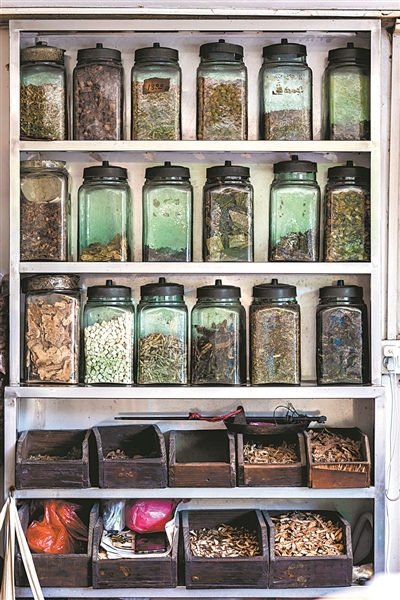 革新路,山草堂草藥涼茶店鋪內(nèi),藥材琳瑯滿目