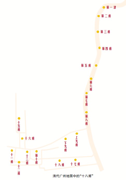 現在,雖然上下九、第十甫、十一甫等帶“甫”字的地名保留了下來,但與過去相比,還是有了不小的變遷。比如,明代開鑿大觀河后,十四甫本在船舶出柳波涌、入珠江的航道附近(大致在今十八甫北路附近),不過,后來河道淤塞,碼頭漸移,十四甫逐漸就消失了。據《荔灣區志》,原本位于今裝帽街和槳欄路一帶的十五甫、十六甫,因清道光年間的一場大火,易地重建于今寶華路一帶,并取名十五甫正街、十六甫新街,以示傳承與區別。十七甫后來也并入了十八甫,如今十八甫路旁還有一條名叫“十七甫北”的小巷子,算是保留了一點記憶。