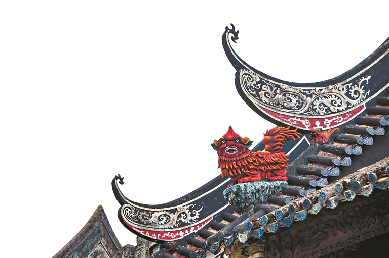 番禺區余蔭山房內,不少建筑的正脊為“龍舟脊”樣式。這種屋脊造型因與龍舟相似而得名,常以灰塑淺浮雕的卷草紋裝飾,或者在脊的兩端各置一條鰲魚。垂脊的脊首部位也往往裝飾有脊獸,有人稱之為嘲風,也是龍子之一。