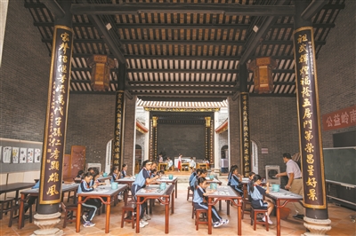 日前,記者來到花都區三華村福元徐公祠。每到下午放學時間,這里的小書包都堆積如山。往古祠堂里看去,仿古磚、滿洲窗等元素與原有的青灰磚、灰塑、壁畫等融為一體,琳瑯滿目的書籍在書架上整齊擺放。在這里,身穿校服的孩子們或專心寫作業,或聚精會神地閱讀書籍。這座成功活化的古建筑,將繼續承載三華村的代代記憶。