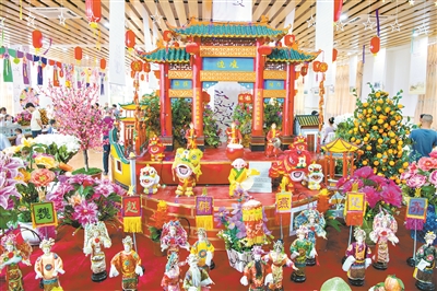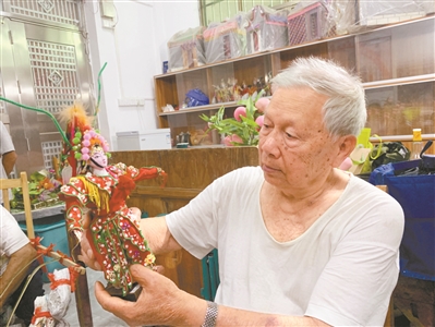 七夕公仔是“擺七娘”的重頭戲。記者看到,無論是風姿綽約的古代四大美人,還是瀟灑飄逸的八仙,抑或是在鵲橋上深情偎依的牛郎織女,無不惟妙惟肖。“做七夕公仔,最考驗集體的智慧。”“巧姐”娥姐說,人物造型、服裝裁剪、工藝刺繡、面相繪畫、鑲嵌、扎作等涉及約45道工序,完成一個公仔至少要四五天。大家分工合作,有的做頭,有的做軀干,有的做四肢,有的做衣服,有的做頭飾,有的做道具,做好后再合成、拼接,才能完成一版人物故事。
