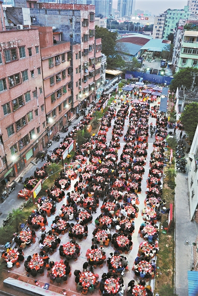 廣州蕭崗村去年設(shè)千桌宴鬧元宵。