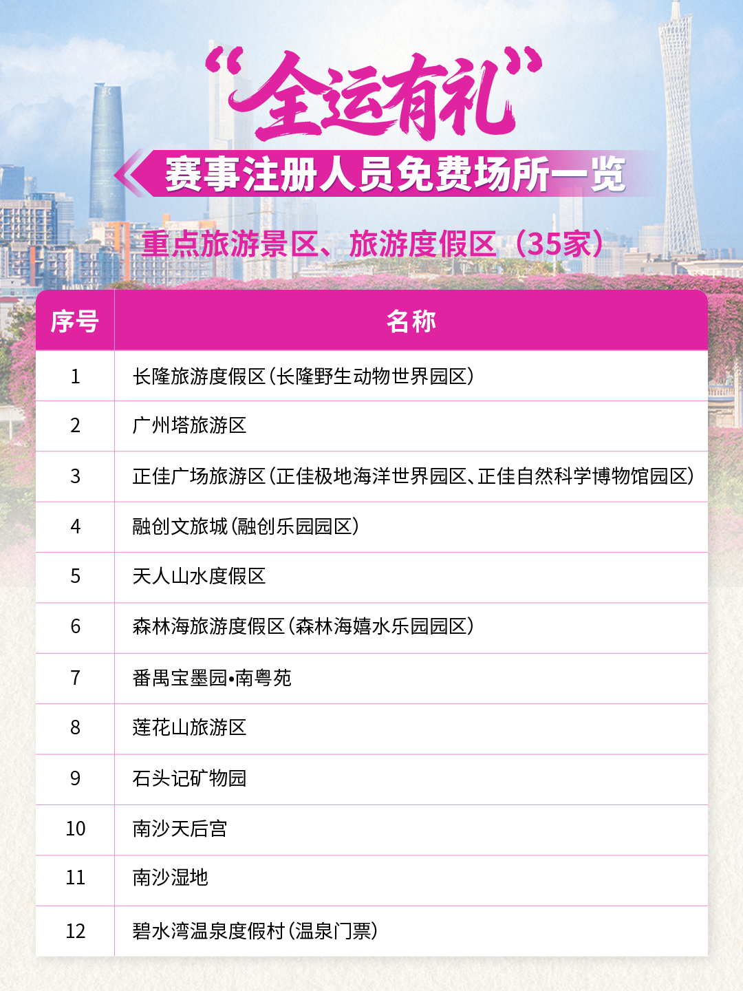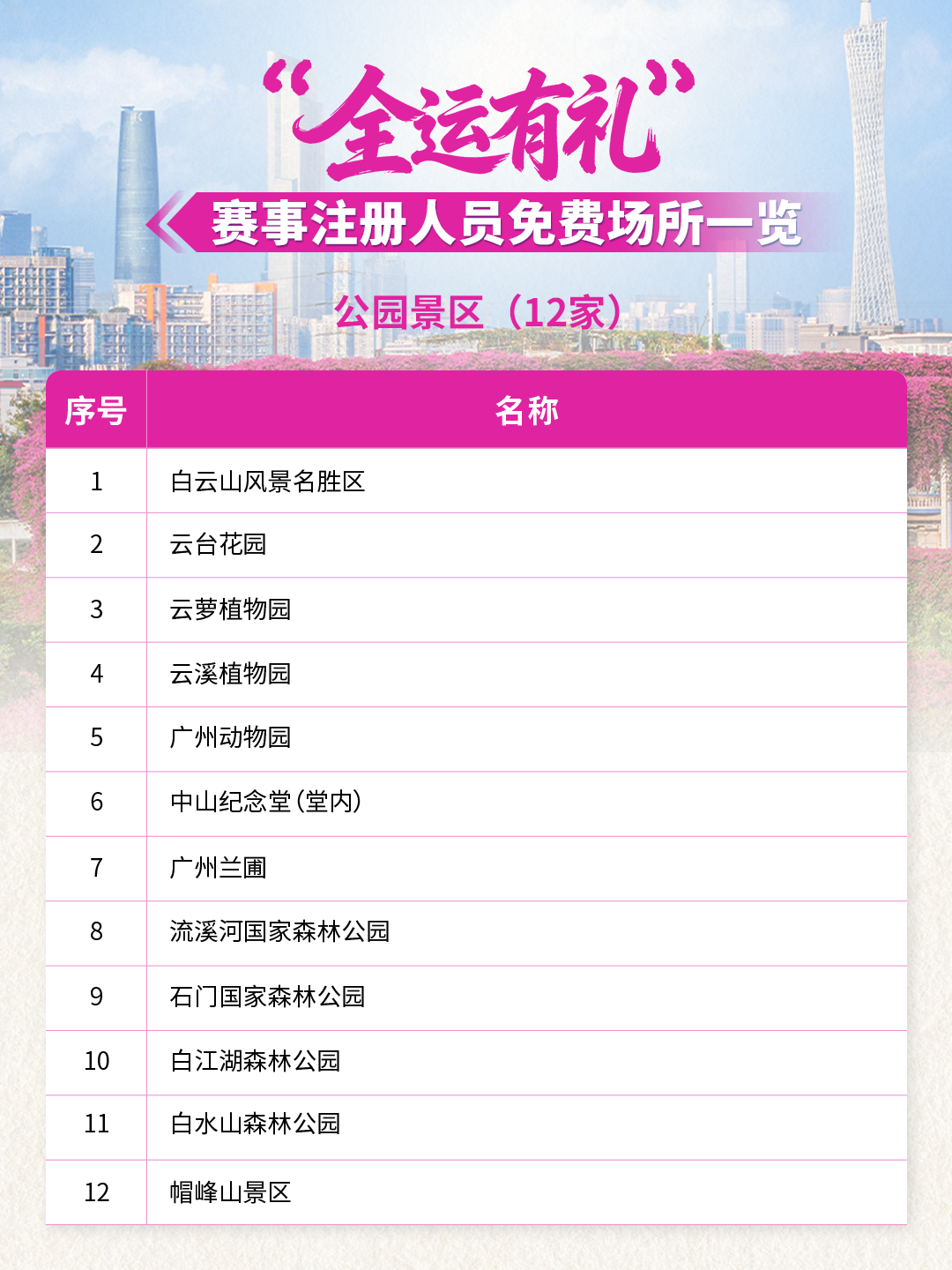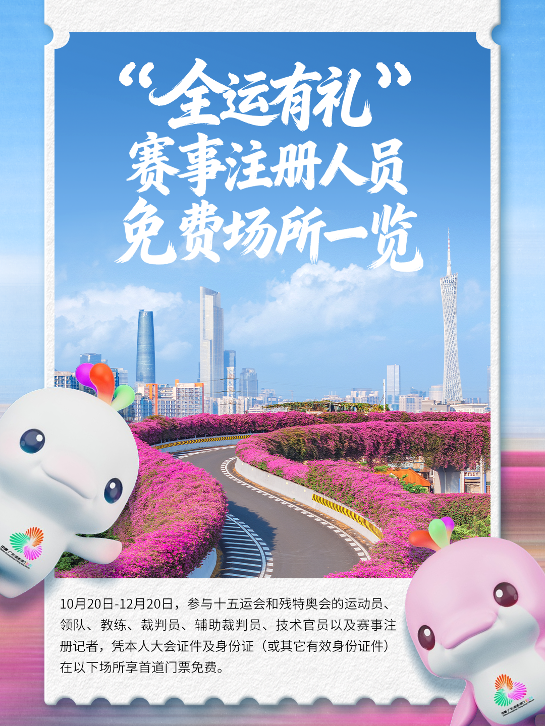 全運(yùn)倒計(jì)時(shí)!59家景區(qū)/場(chǎng)所聯(lián)合獻(xiàn)禮!10月20日-12月20日期間參與十五運(yùn)會(huì)和殘?zhí)貖W會(huì)的運(yùn)動(dòng)員、領(lǐng)隊(duì)、教練、裁判員、輔助裁判員、技術(shù)官員以及賽事注冊(cè)記者,憑本人大會(huì)證件及身份證(或其它有效身份證件),在這些場(chǎng)所可享首道門(mén)票免費(fèi)!