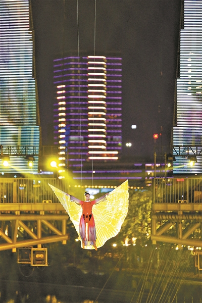 舞蹈演員揮舞著翅膀“飛”在空中,她身后是珠江對岸的廣報中心。