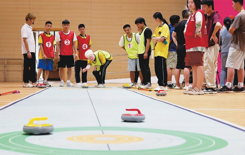 學(xué)生現(xiàn)場(chǎng)體驗(yàn)旱地冰壺運(yùn)動(dòng)。