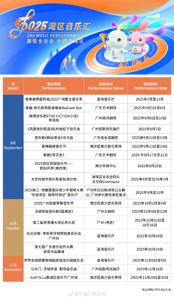 據(jù)悉,除開幕大戲《茶花女》之外,本屆“灣區(qū)音樂匯”還將推出眾多亮點活動,持續(xù)至年底,涵蓋戶外音樂節(jié)、國際名家名團演出、原創(chuàng)音樂推廣和本土音樂傳承四大板塊,共計130余場演出活動。據(jù)悉,今年音樂匯規(guī)模進一步擴大,活動覆蓋全市11個區(qū),演出場所不僅包括專業(yè)劇院,還延伸至南沙、花都、增城等戶外場地,著力構建“全域舞臺、全時體驗”的音樂生態(tài)布局。尤為值得一提的是,本次活動與第十五屆全運會深度融合,以藝術形式傳遞體育精神與拼搏激情。屆時,來自全球二十多個國家和地區(qū)的藝術團體及個人將登臺獻藝,在展現(xiàn)國際藝術視野的同時,粵語音樂劇、廣東民樂等廣府特色節(jié)目也將集中亮相,進一步促進文旅消費和夜間經(jīng)濟的提質(zhì)擴容。