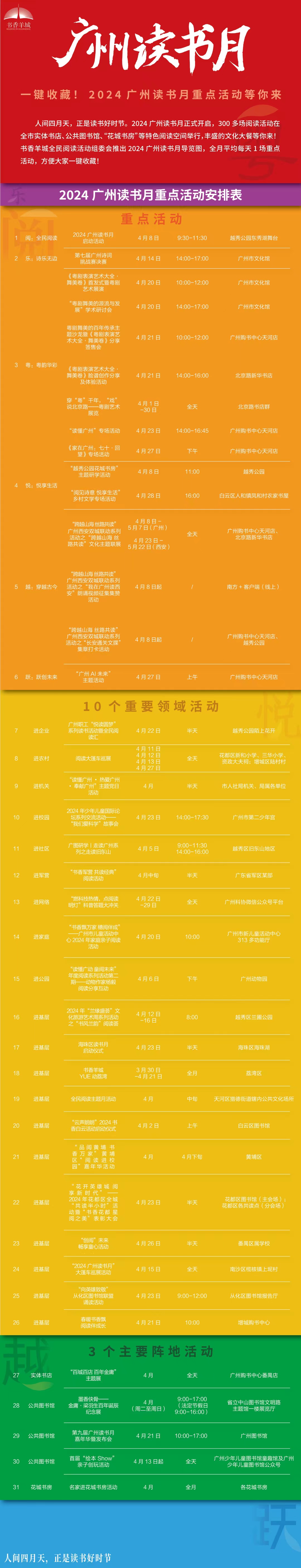作為一座崇文重教的城市,廣州自古以來守護文脈,向上生長。為深化書香羊城全民閱讀活動,扎實推進“閱讀之城”建設,由書香羊城全民閱讀活動組委會指導,中共廣州市委宣傳部、廣州市新聞出版局、廣州新華出版發行集團主辦的2024廣州讀書月系列活動即將在4月8日正式啟動。