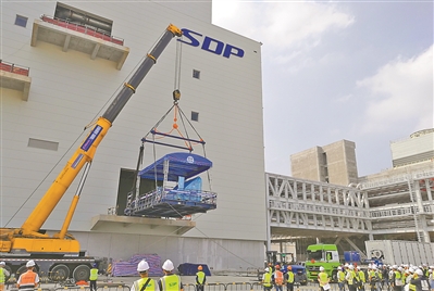 2月14日,廣州增城富士康超視堺第10.5代顯示器全生態產業園區投資項目第一臺核心設備8K高精度曝光機按原計劃吊裝進場。