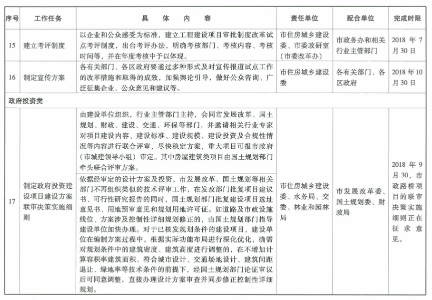 2.明晰審批權責。政府部門建立技術審查清單,只對清單內的技術審查結果進行符合性審查,不再介入技術審查工作。建設單位承擔技術審查工作的主體責任,具體工作可以依托技術專家、技術評審機構,涉及質量、安全、造價的技術審查工作應做深做細。建立建設單位法人負責制和工程師簽名責任制,落實建設單位主體責任。(牽頭單位:市發展改革委、國土規劃委、住房城鄉建設委)