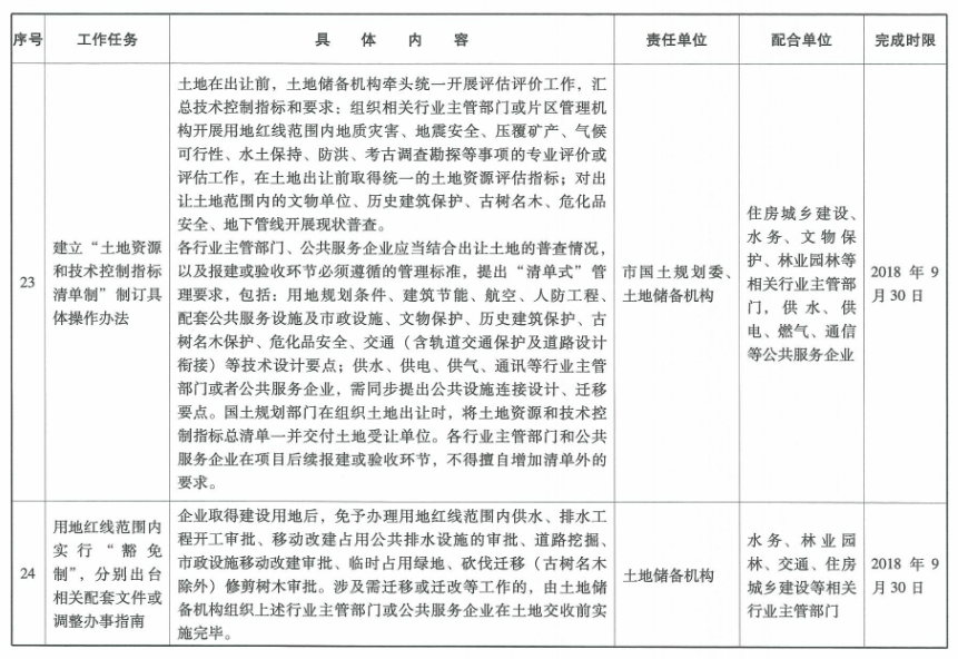 國土規劃部門在組織土地出讓時,將土地資源和技術控制指標總清單一并交付土地受讓單位。各行業主管部門和公共服務企業在項目后續報建或驗收環節,不得擅自增加清單外的要求。(牽頭單位:市國土規劃委、土地儲備機構,配合單位:住房城鄉建設、水務、文物保護、林業園林等相關行業主管部門,供水、供電、燃氣、通信等公共服務企業)