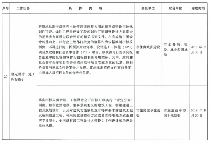 13.優化設計招標定標辦法。落實招標人負責制,工程設計公開招標可以實行“評定分離”制度。城市重要地段、重要景觀地區的建筑工程、橋梁隧道工程及規劃設計,以及對建筑功能或景觀有特殊要求的建筑工程及橋梁隧道工程,可采用邀請招標方式或直接委托方式由相應專業院士、全國或省級工程設計大師作為主創設計師的規劃設計單位承擔。(牽頭單位:市住房城鄉建設委、國土規劃委、發展改革委)