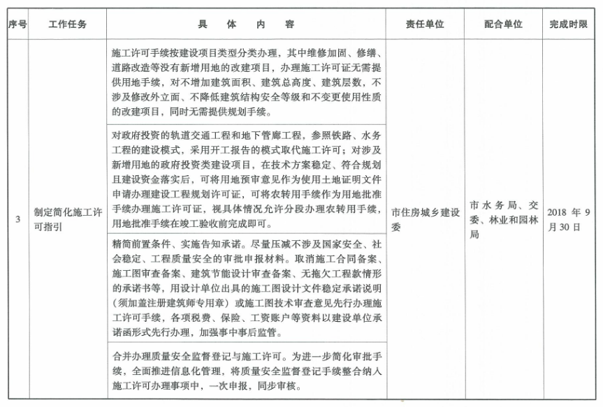 11.合并辦理質量安全監督登記與施工許可。全面推進信息化管理,將質量安全監督登記手續整合納入施工許可辦理事項中,一次申報,同步審核。(牽頭單位:市住房城鄉建設委)