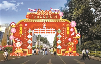 白云花市牌樓設計以中國傳統的大紅燈籠為主題造型,配以小燈籠、桃花、飛機進行點綴,加上白云山、云臺花園等白云區知名景點以及寓意招財納福、福祿雙全的招財鼠和大福袋,呈現國泰民安、喜慶團圓、一派祥和的景象。
