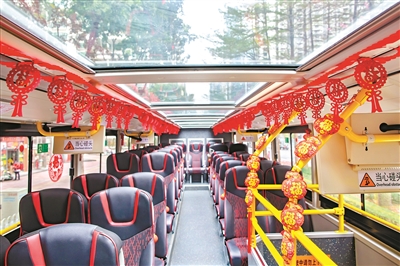 雙層巴士的外觀確實與眾不同,全車噴繪有“賞城看花”年味特色涂裝,以吉祥的中國紅為主色調,通過融合剪紙藝術、廣式宮燈、羊城建筑等元素體現廣府文化符號。