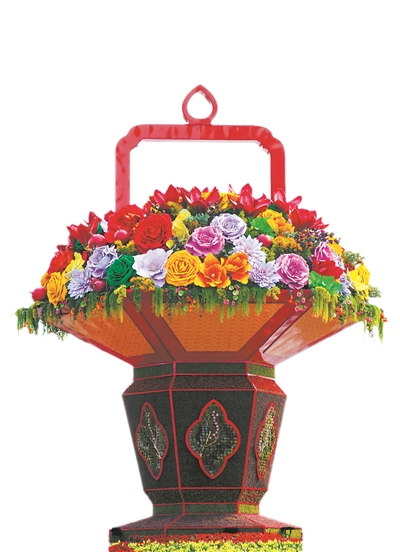 花籃上直徑超過1米的大花有120多朵,小花有1600多朵,以木棉花為主,搭配牡丹、月季、玉蘭等,百花齊放,象征春滿大地。花籃籃身共有六個面,每個面15平方米,采用約11萬株紅草繡植,中間以海棠紋花窗鑲嵌多肉植物,六幅多肉畫作品承載了新年的美好祝愿。