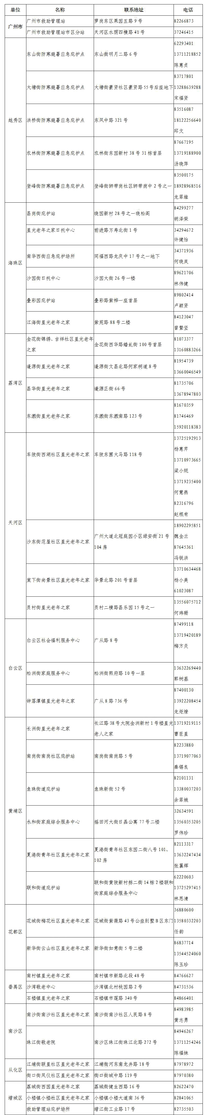 庇護場所廣州市各區(qū)24小時防寒避暑臨時庇護場所地址和電話一覽表