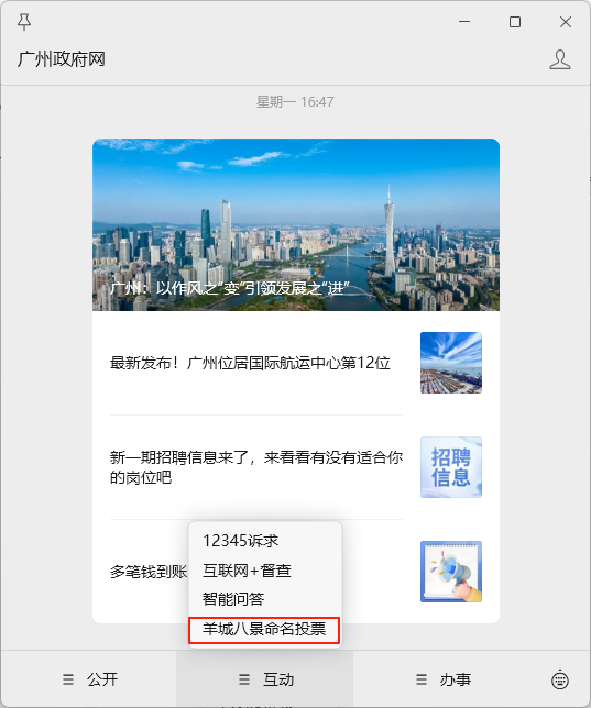 在菜單欄“互動(dòng)”中點(diǎn)擊“羊城八景命名投票”(詳見(jiàn)截圖),即可進(jìn)入投票。