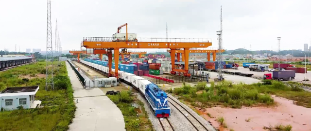 “嗚~嗚~嗚~~~”——伴隨著汽笛聲響,滿載貨物的國際班列從廣州東部公鐵聯運樞紐(增城西站)緩緩駛出,一路向西奔馳,去往歐洲、中亞、東南亞等地。