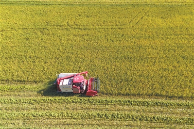 廣州大吉沙島上,無人駕駛收割機在稻田里進行全自動化作業。