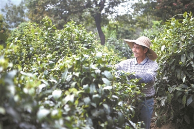 廣州黃埔區嶺頭山上,茶農打理自家的茶園。