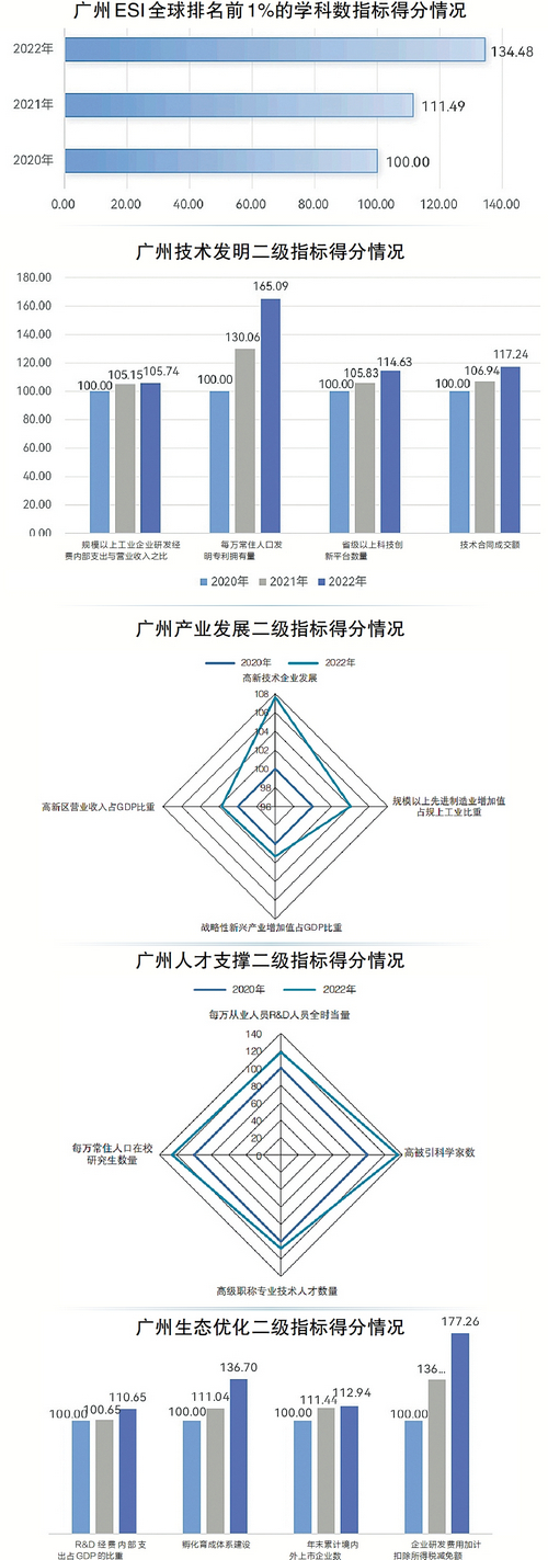 2022年該指標得分為109.37分,年均增長4.68分。近年來,廣州持續加大全社會基礎研究投入,優化實施市校(院)企基礎研究聯合資助計劃,完善基礎研究人才梯隊支持體系。2022年全社會基礎研究經費內部支出達到120.97億元,基礎研究經費占R&D(研究與試驗發展)經費的比重為12.24%,遠高于全國平均水平(6.57%);ESI全球排名前1%的學科數量增長快速,居全國前列;省級科學技術獎達到143項,同比增長6.72%。廣州從源頭和底層解決關鍵技術問題,極大推動了原始創新能力的提升,區域創新潛力進一步提升。