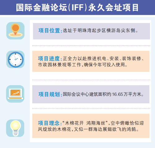 空中俯瞰恰似迎風綻放的木棉花,又似一群海邊展翅欲飛的鴻鵠……在南沙,一朵別樣的“木棉花”正悄然盛開。近日,記者了解到,被譽為粵港澳大灣區新地標的國際金融論壇(IFF)永久會址項目正在緊鑼密鼓施工中,確保盡快投入使用。未來國際金融論壇全球年會將穩定在IFF永久會址上舉辦,打造成為與達沃斯論壇、博鰲論壇媲美的全球性金融會議品牌,助力南沙打造成為世界新金融及絲路合作對話高地。