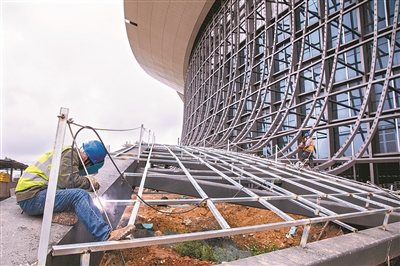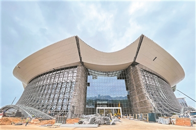 記者在現場看到IFF永久會址國際會議中心金屬屋面的裝飾鋁板已鋪設完成,“木棉花”已然盛開。彎曲起伏的屋面,讓整個建筑造型優雅靈動,空中俯瞰恰似迎風綻放的木棉花,又似一群海邊展翅欲飛的鴻鵠。