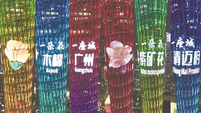 “一朵花一座城”和“廣州木棉”“清邁府紫礦花”等字幕和花卉圖案在廣州塔身徐徐滾動