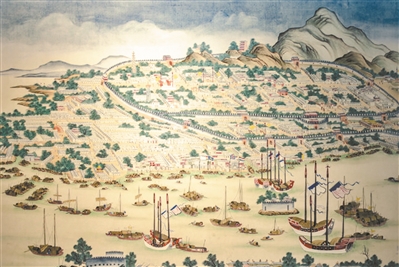 “一口通商”給廣州帶來前所未有的商業繁榮。由此,珠江三角洲形成了以廣佛為核心的“前店后廠”式的產、供、銷外貿經濟鏈。明朝廣東地方官員采用“定期市”的外貿形式,允許葡萄牙人在澳門居住,每年夏秋兩季到廣州與中國商人進行外貿交易。這是有據可查的“廣交會”最早的形式。明代,官方把宋三城合一,并建新城,清代建雞翼城,十三行在城墻之外的城西興起,“海珠寺前江水奔,諸洋估舶如云屯。”一句詞,描繪出廣州萬商云集的繁華景象。