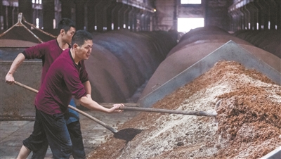 經沈倫華等眾多工匠師傅用心封窖的車間在五糧液廠區有很多。當記者走進全世界最大的單體固態發酵車間——五糧液523釀酒車間時,只見1.3萬多口封好的窖池,猶如一個個烤好的“大饅頭”,蔚為壯觀。車間外,人們還穿著羽絨服,冷得直打哆嗦,車間里,蒸氣升騰,一派熱火朝天的景象:4000多名釀酒工人穿著特制的防靜電背心短褲、耐高溫拖鞋,揮鏟起糟、上甑、蒸餾、摘酒、攤涼……