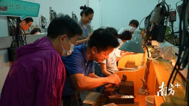 廣州不僅海絲文化源遠流長,非遺文化也博大精深。“絲路十三行”品牌系列活動推出了打金(銀)、木雕、茶藝3場非遺體驗活動,受到眾多年輕人的追捧。其中打金(銀)體驗活動在中華老字號“第一福”舉行,這里是廣東省傳統工藝美術產業保護和發展基地、省級唯一“手工打金”非遺傳承基地,市民實地參觀了解打金(銀)技藝的發展歷史后,還親自動手體驗打金,從而對傳統工藝與現代工業相結合有了更深的認識。茶藝體驗活動邀請廣府茶藝傳承人陳秀蘭帶領大家參觀廣府茶藝體驗中心,學習廣府茶藝理論和廣府茶藝十式,品悟中華茶道文化。