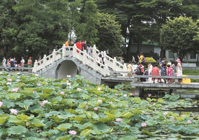 浮香繞曲岸,圓影覆華池。趁著仲夏的暖風,荷花悄然盛開在蓮塘春色景區——層層疊疊的荷葉愜意地立于水面,有的荷花含苞待放,有的已結成蓮蓬,還有的正綻放在綠葉中……閑坐在涼亭中,滿園粉紅翠綠映入眼簾。荷葉間不時有小魚兒游過,儼然是一處避暑、賞荷的好去處。
