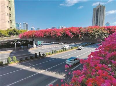 員村三橫路和員村四橫路對出的天橋兩側,盛開的簕杜鵑花像瀑布一樣垂下