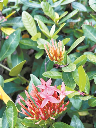 常見歸常見,驚喜卻不斷。龍船花在園林中常被修剪成條狀,開花時節為花蘺,不開花時為綠籬。最大的亮點是形色富于變化,隨著季節和花色的不同而呈現給人們不同的彩色花帶,時常令匆匆路過的人群忍不住放慢腳步。