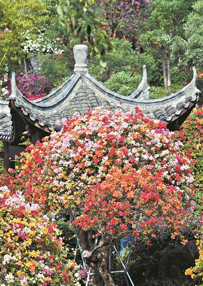 記者隨即來到一簇三角梅面前,才發現五顏六色引人矚目的并不是三角梅的花瓣,而是它的葉子。“三角梅別名是簕杜鵑,深受廣東人喜愛。它的盛開其實是葉子發生‘變態’成了鮮艷的顏色,遠遠望去,宛如群花盛開一般,特別壯觀?!蓖跖空f道。園內的三角梅并不是按照片區分布,而是通過盆栽的方式如星星點綴在整個園子的各處,讓你無論是在河邊踱步,還是園內駐足,都能夠看到一枝獨秀或者花團錦簇的三角梅,可謂是步步皆景,令人賞心悅目。