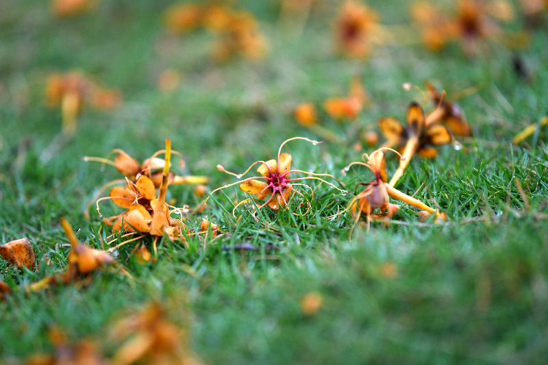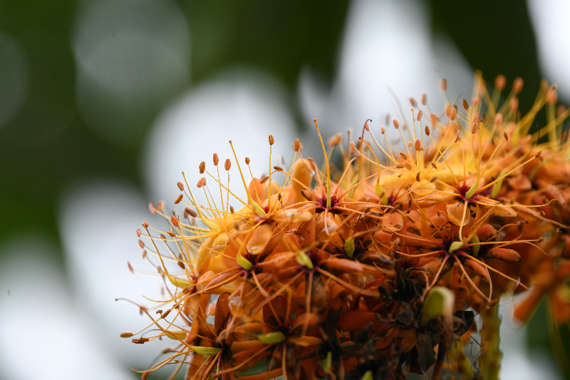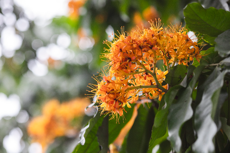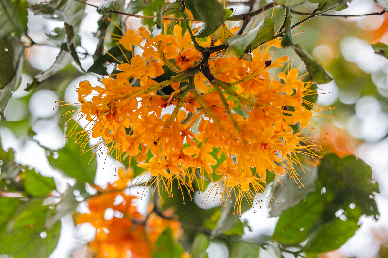 由于無(wú)憂花盛花時(shí)開滿樹頭,金黃橙紅的花朵,像團(tuán)團(tuán)跳動(dòng)的火焰,因此也有“火焰花”之稱。看著樹冠上覆蓋著金黃色的花朵,躍躍向上,動(dòng)感十足,令人目不暇接,心情也隨之舒暢。
