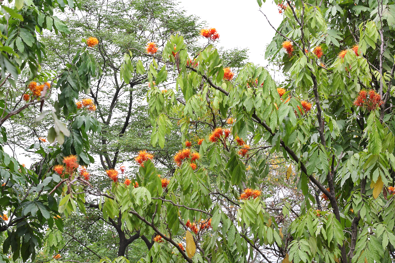 無(wú)憂樹樹冠橢圓狀傘形,樹姿雄偉,葉大翠綠,花序大型,花期長(zhǎng),盛花期花開滿樹頭,橙紅似火焰,有“火焰花”之稱。