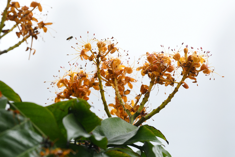 離開珠江公園,走進(jìn)華南國(guó)家植物園,在龍洞琪琳湖邊,遠(yuǎn)遠(yuǎn)就能望見一棵大樹,滿樹開放著金黃色繡球形的花朵,艷麗奪目。此樹就是柬埔寨原國(guó)王西哈努克和夫人當(dāng)年親手種植的無(wú)憂樹,每年三月至五月開花,盛開時(shí)整個(gè)樹冠都被狀如火炬般的金黃色小花覆蓋,百米以外仍可見燦爛奪目的花球,仿佛一支燃燒的火炬。今年該樹開花稍早,近日也因?yàn)樘煊暝颍洳簧佟?/p>
