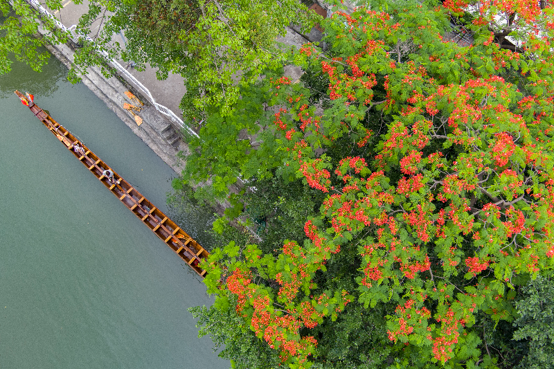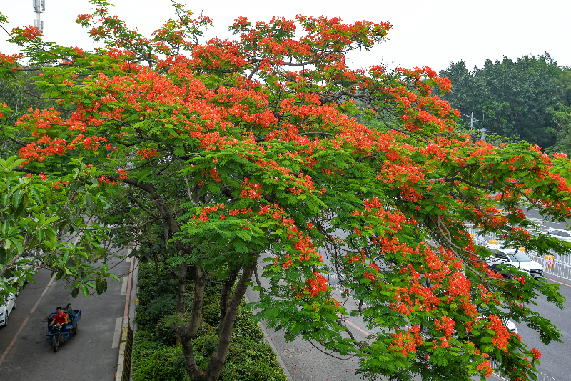 生態(tài)愛好者劉先生記得,廣州在20世紀60年代就種有鳳凰木。在他的筆記里,可以找到1982年對海珠廣場一棵鳳凰木的觀察,“樹木很高大,花開時節(jié)非常引人注目,有時候感覺花比葉還多,因此每每經(jīng)過,都忍不住抬頭看看。”據(jù)其介紹,廣州近郊水鄉(xiāng)的居民,習慣用“龍船花”或“龍舟花”來稱呼它,這是因為鳳凰木往往在端午節(jié)前后盛放繁花,正值“龍舟水”時節(jié),龍舟競渡十分熱鬧。對于人們來說,鳳凰木的這一特點也使它成了預告雨季來臨的“氣象員”。