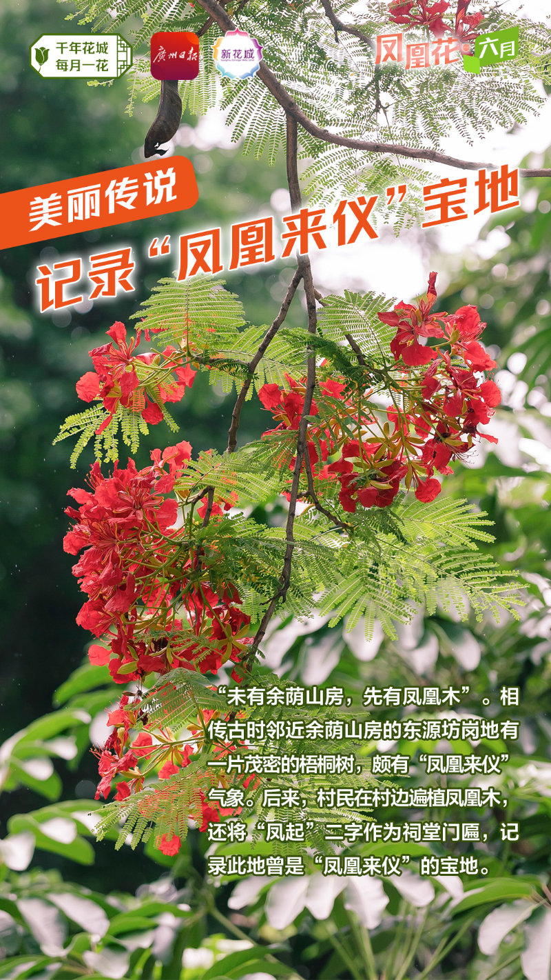 不少廣州街坊都喜歡熱情洋溢的鳳凰木,番禺南村還流傳“未有余蔭山房,先有鳳凰木”的說法。相傳古時鄰近余蔭山房的東源坊崗地有一片茂密的樹林,林木蔥蘢,頗有“鳳凰來儀”之氣象。村民在村邊種植鳳凰木作為風水樹,還將“鳳起”二字作為祠堂的門匾,記錄了此地曾是“鳳凰來儀”的寶地。鳳凰花開時,花朵鮮紅熾烈如火,如紅云彌漫,有詩贊曰:“得汝清蔭勝幔紗,山房一隅鋪彩霞。”