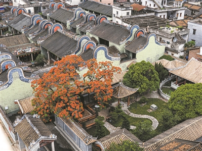 怒放的鳳凰花與古祠堂的鑊耳、灰塑交相輝映,形成一道獨特的嶺南風景。