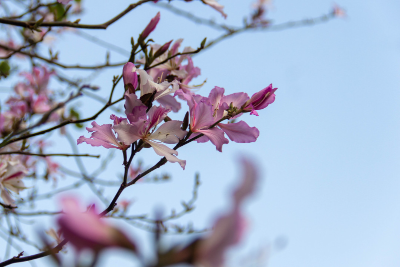 宮粉紫荊(Bauhinia variegata L.)中文學名:宮粉羊蹄甲,別稱洋紫荊,花美麗而略有甜味,盛花期從2月至3月底,是良好的觀賞及蜜源植物。它的花語是親情、兄弟和睦、家業興旺。