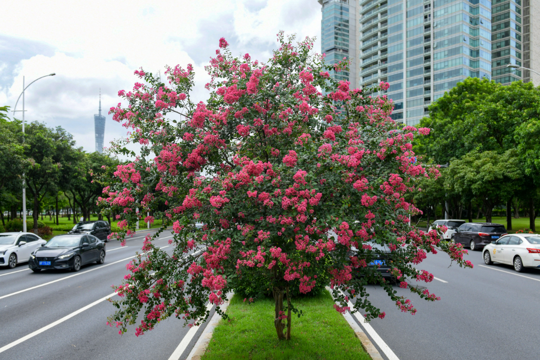 春天“上林花似錦”,是故“出門(mén)俱是看花人”。其實(shí)夏天的廣州同樣色彩繽紛。比如,路旁、涌邊、公園里……很多地方都有著小葉紫薇的俏麗身影。小葉紫薇花團(tuán)錦簇,看上去顯得既濃郁又含蓄。