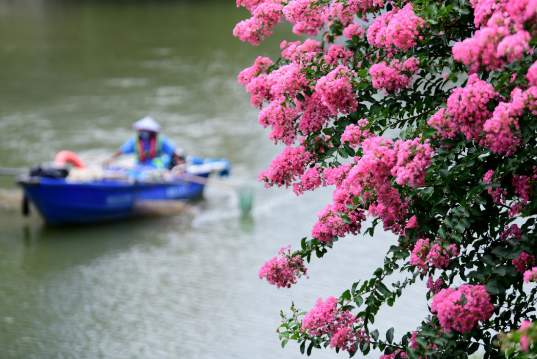 小葉紫薇的葉子較小,花簇沉甸,花色繽紛。一簇簇鮮艷的花朵猶如搖曳的風(fēng)鈴,徜徉其中宛如置身一片萬(wàn)紫千紅的花海,吸引不少市民游客拍照打卡。