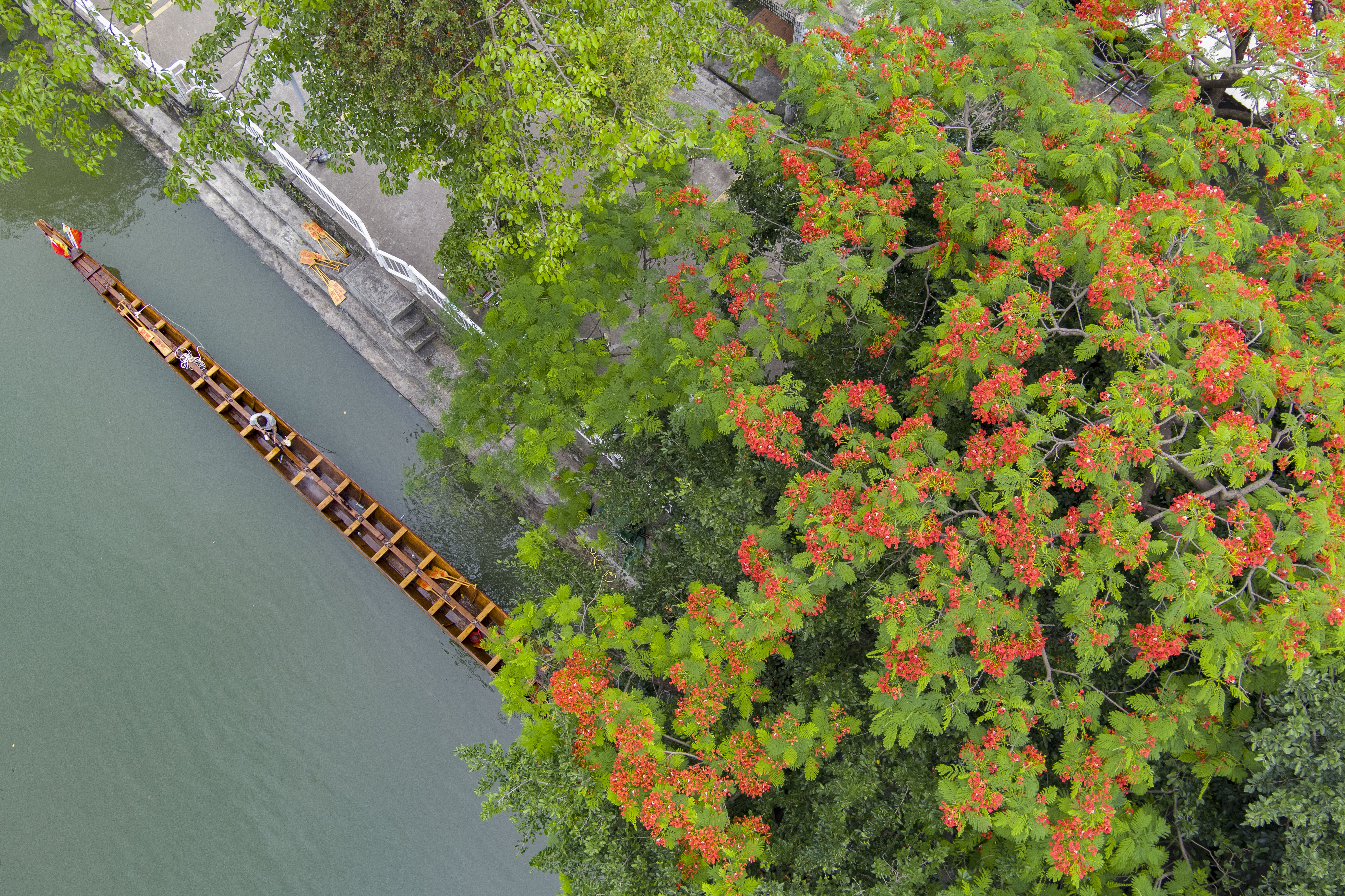 生態愛好者劉先生記得,廣州在20世紀60年代就種有鳳凰木。在他的筆記里,可以找到1982年對海珠廣場一棵鳳凰木的觀察,“樹木很高大,花開時節非常引人注目,有時候感覺花比葉還多,因此每每經過,都忍不住抬頭看看。”據其介紹,廣州近郊水鄉的居民,習慣用“龍船花”或“龍舟花”來稱呼它,這是因為鳳凰木往往在端午節前后盛放繁花,正值“龍舟水”時節,龍舟競渡十分熱鬧。對于人們來說,鳳凰木的這一特點也使它成了預告雨季來臨的“氣象員”。