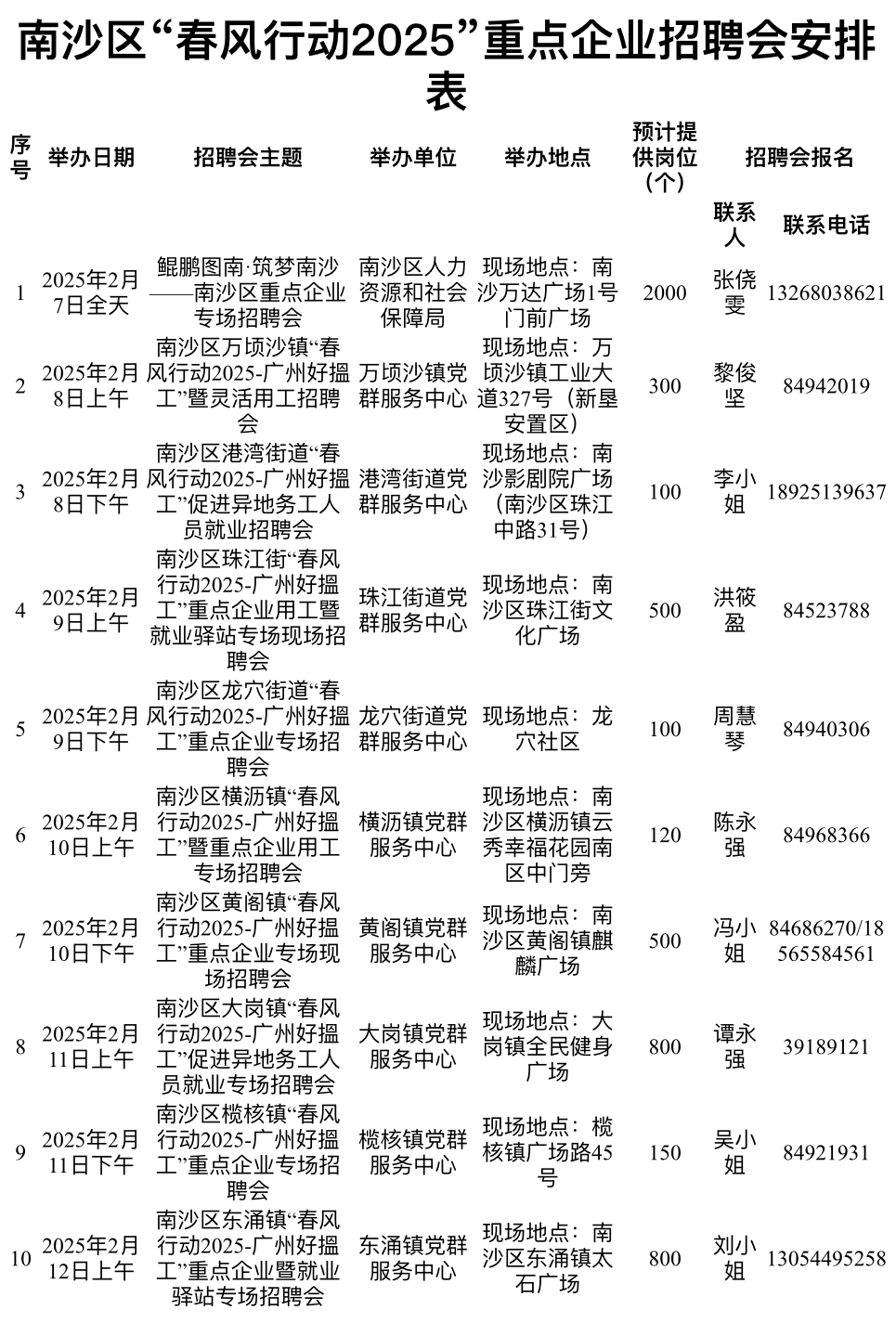據(jù)悉,“春風(fēng)行動(dòng)”期間,南沙區(qū)將高頻次舉辦分類型、分領(lǐng)域的專場(chǎng)招聘活動(dòng),并開設(shè)線上招聘專區(qū),全面啟動(dòng)線下招聘會(huì),著力暢通供需對(duì)接。2月至3月,南沙區(qū)計(jì)劃舉辦40場(chǎng)線上線下招聘活動(dòng),免費(fèi)為企業(yè)及求職者搭建供需對(duì)接平臺(tái)。