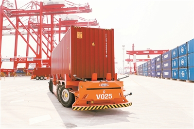 北斗導(dǎo)航無(wú)人駕駛智能導(dǎo)引車可在碼頭堆場(chǎng)間自由穿梭。